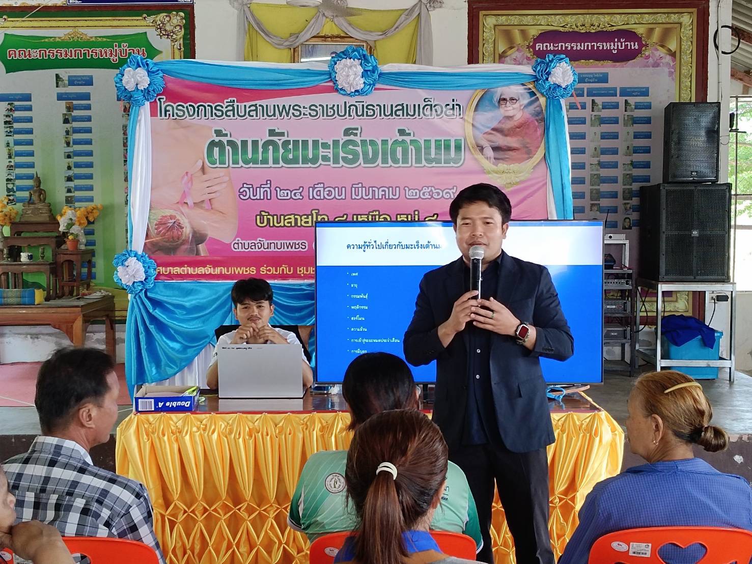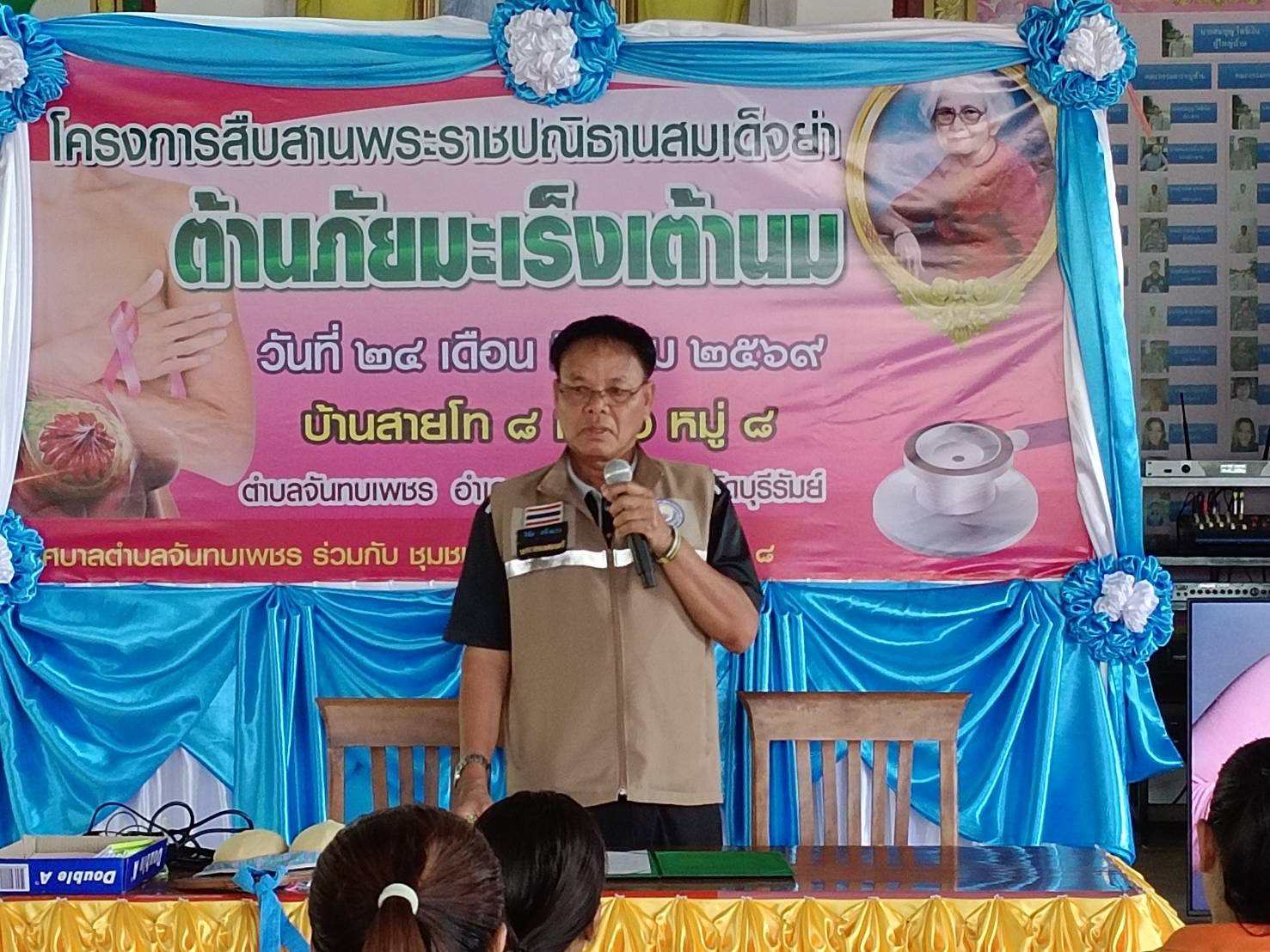 เทศบาลตำบลจันทบเพชร วันที่ 24 มีนาคม 2569 เวลา 08.30 น. นายธีระศักดิ์ บุญด้วง นายกเทศมนตรี ได้มอบหมายให้ นายวิชัย แข็งแรง รองนายกเทศมนตรี เป็นประธานในพิธีเปิดโครงการสืบสานพระราชปณิธานสมเด็จย่า “ต้านภัยมะเร็งเต้านม” หมู่ 8 บ้านสายโท 8 เหนือ พร้อมด้วยสมาชิกสภา เจ้าหน้าที่กองสาธารณสุขและสิ่งแวดล้อม ร่วมกับ ผู้นำชุมชน และ อสม. ณ ศาลากลางหมู่บ้าน หมู่ 8
